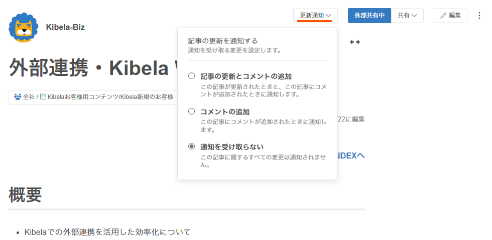 任意の記事の変更の通知設定は、該当記事の右上「更新通知」より可能です。自分が投稿した記事以外でも、常に更新状況を知りたい時にご利用ください。