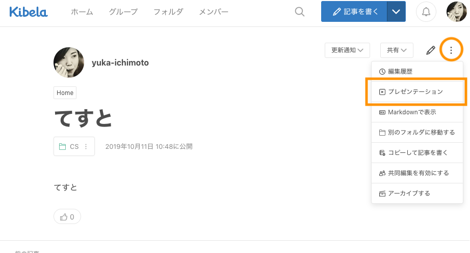 2025/10/01 プレゼンテーション表示 プレゼンテーションモードに切り替え、記事を大きく表示させます。ご登壇やミーティング等にご利用ください。 記事を大きく表示させる「プレゼンテーションモード」に切り替えることができます。 手順:記事詳細画面から「︙」アイコン > プレゼンテーションを押下する。
