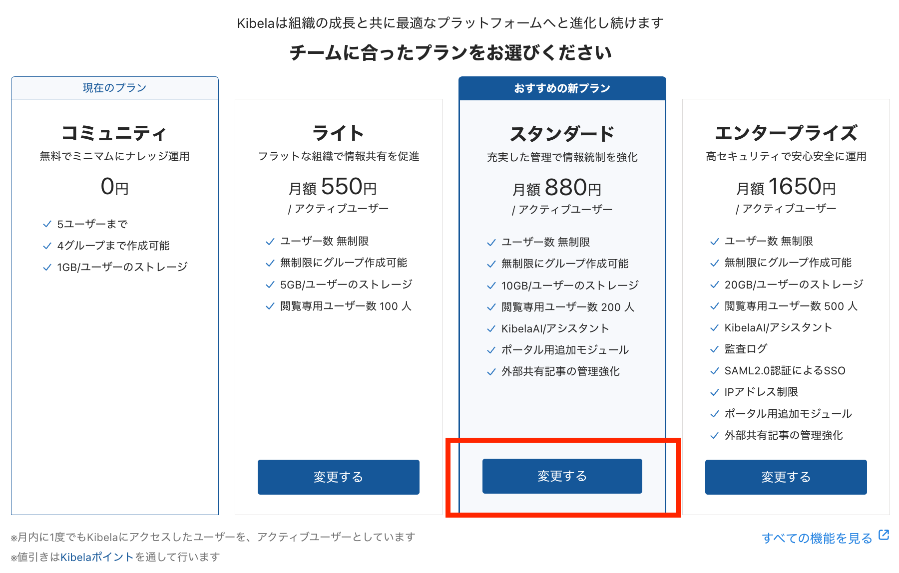 Kibelaでは、コミュニティプラン、ライトプラン、スタンダードプラン、エンタープライズプランの4種類を提供しています。