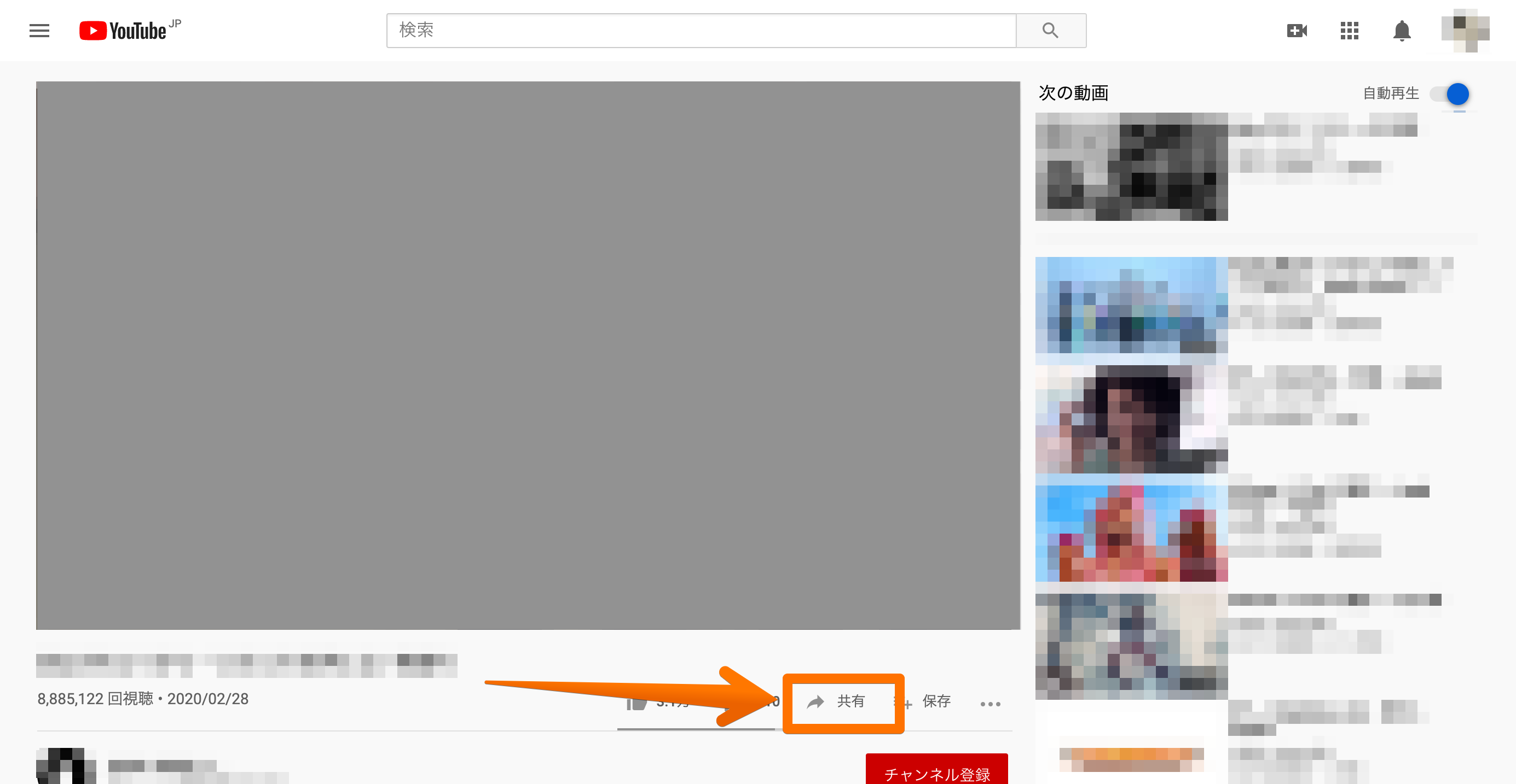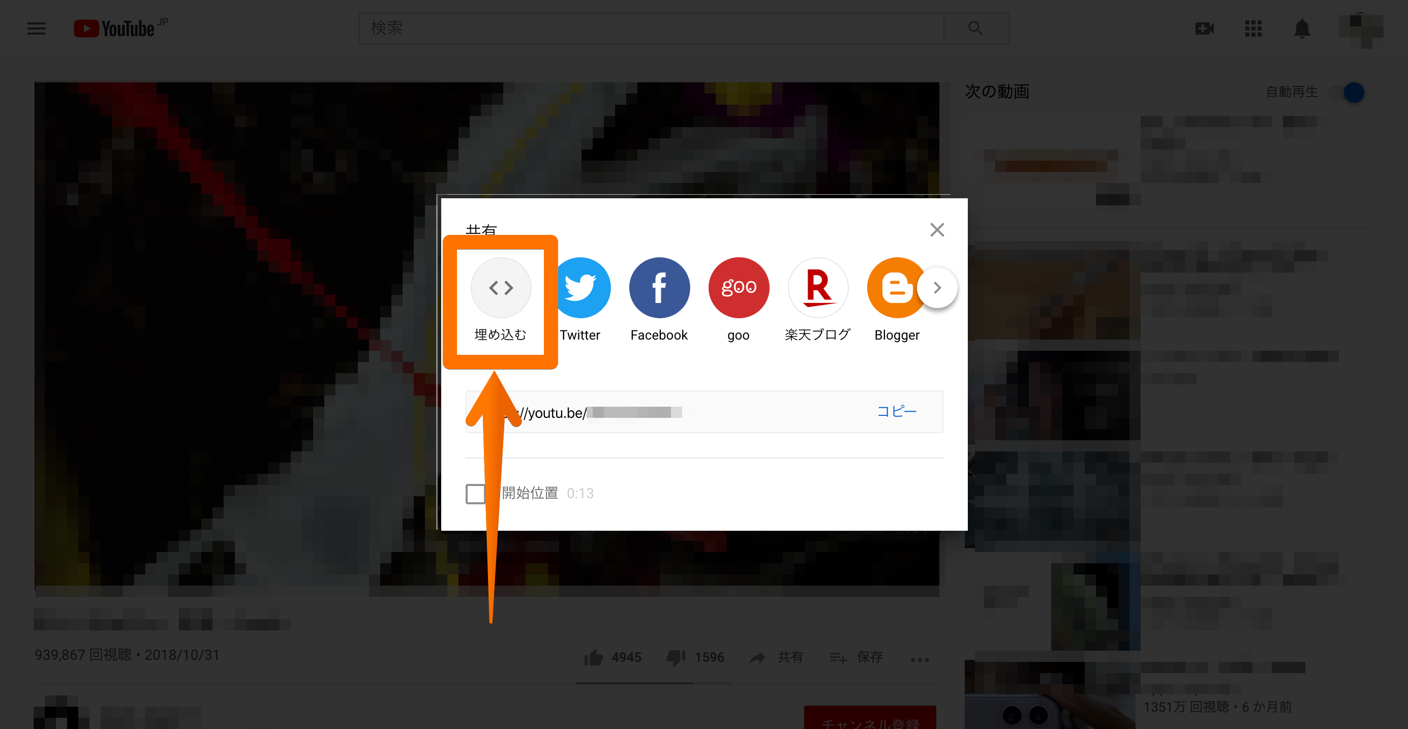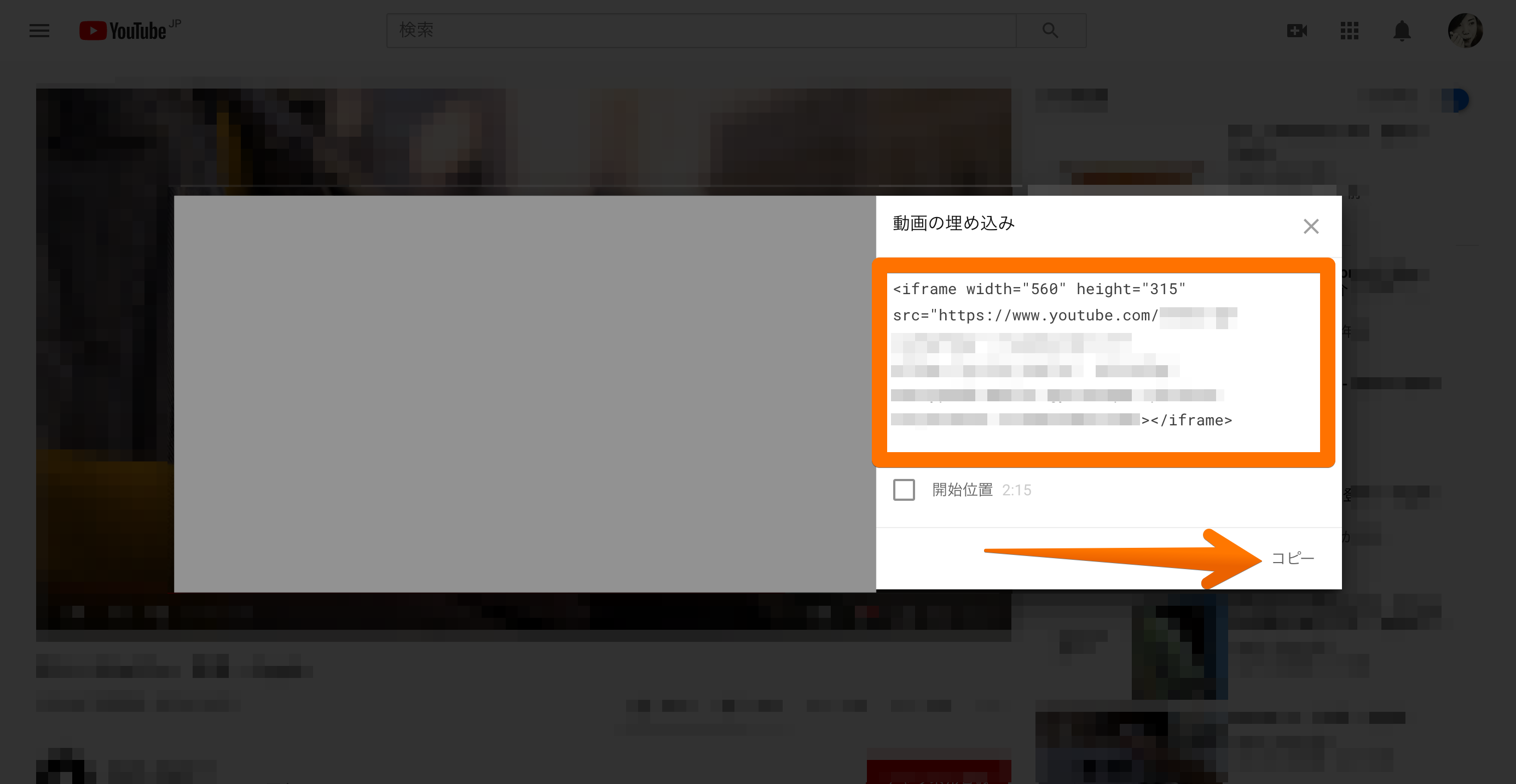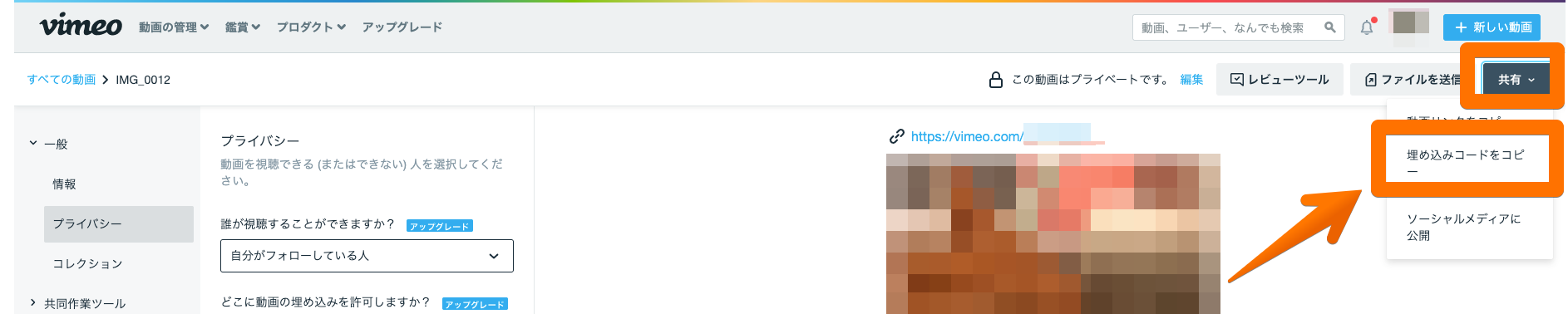 - 動画の設定ページ右端上にある「共有」をクリック。「埋め込みコードをコピー」を選択