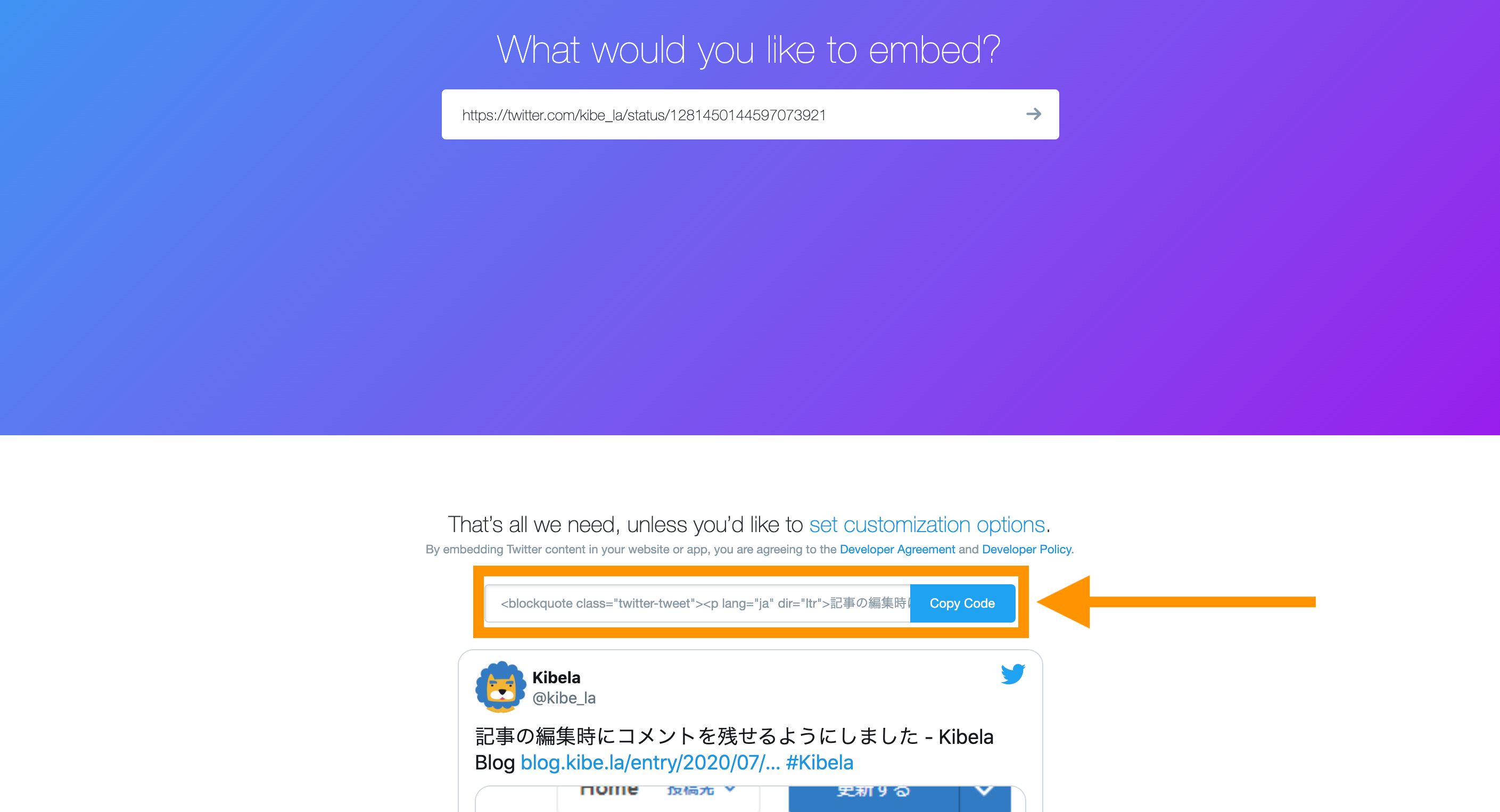 - 記事に埋め込むためのURLが生成されますので「Copy Code」をクリックしてコピー