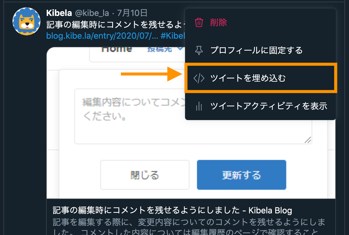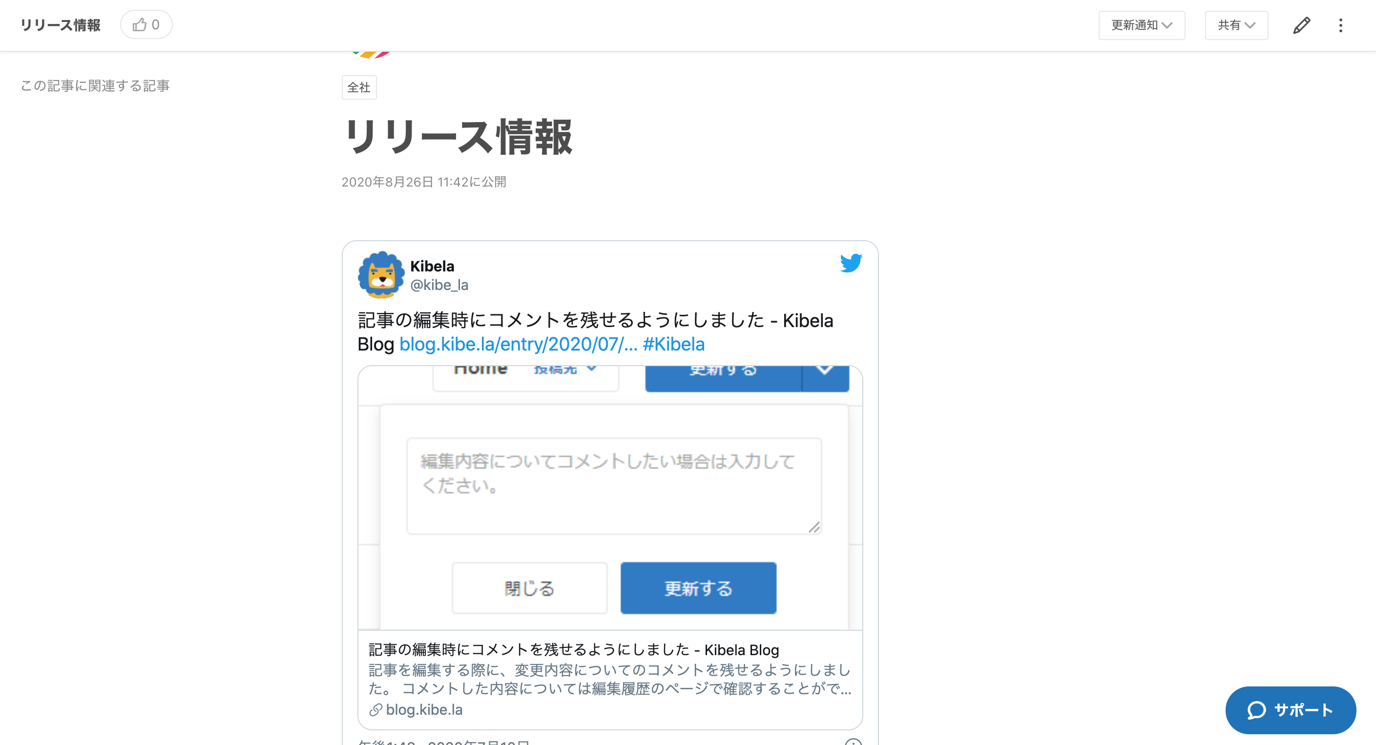 - コピーしたコードをKibela記事へペーストすると埋め込みが完了