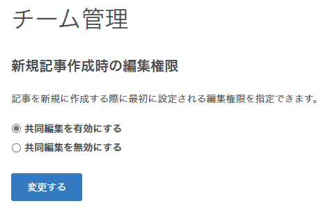 2025/10/02 記事のデフォルトの編集権限の設定について 記事を作成する際のデフォルトの編集権限を設定できます。 本操作は、管理者/オーナー権限のユーザーのみが行えます。 設定 > チーム設定 > チーム管理 「共同編集を有効にする」をチェックしている場合は、新規記事投稿時のチェックがデフォルトで有効になります。