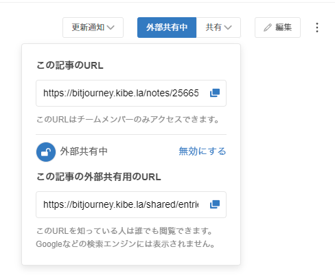この為、外部共有専用URLを使うには、「誤って第三者にURLを公開したときに、その記事を見れてしまう」という点をご留意いただいた上でお使いください。