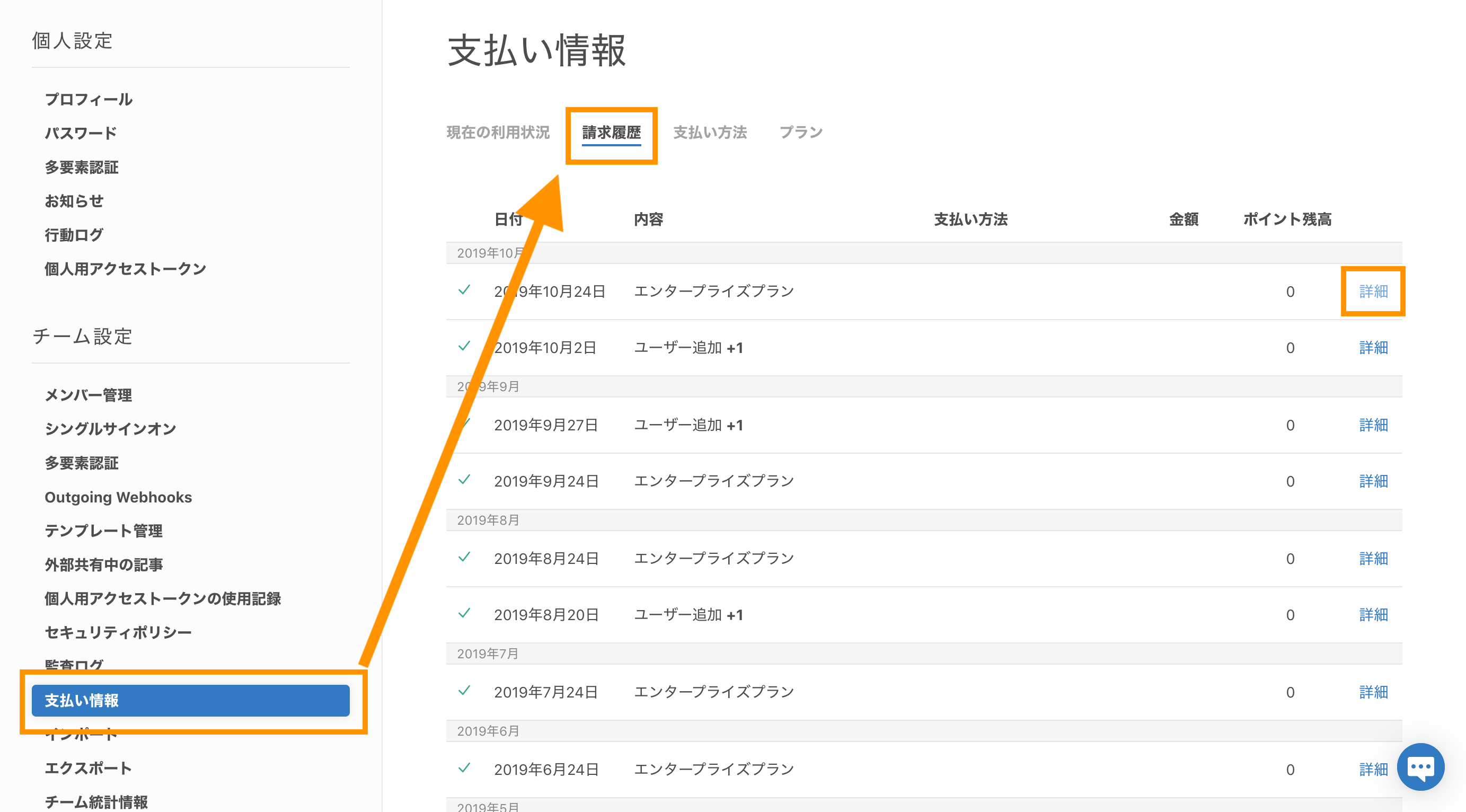 2025/10/01 請求履歴を確認する 請求履歴および領収書の確認ができます。 オーナー権限のみ閲覧可能です。 次の手順でご確認いただけます。 プロフィールアイコンをクリック 「設定」を選択 3. 「支払い情報」を選択 4. 請求履歴をクリックすると、これまでの請求履歴を確認いただけます。 また、「詳細」をクリックしていただくと領収書が表示されます。 ご請求に関するお問い合わせはオーナー権限のユーザー様よりお問い合わせください。