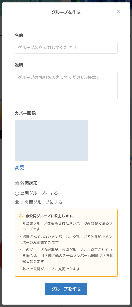 非公開グループは、グループに閲覧制限をかけて、限られたメンバーだけに記事を公開する機能です。記事の投稿先を非公開グループすると、その記事へのアクセスが制限されます。