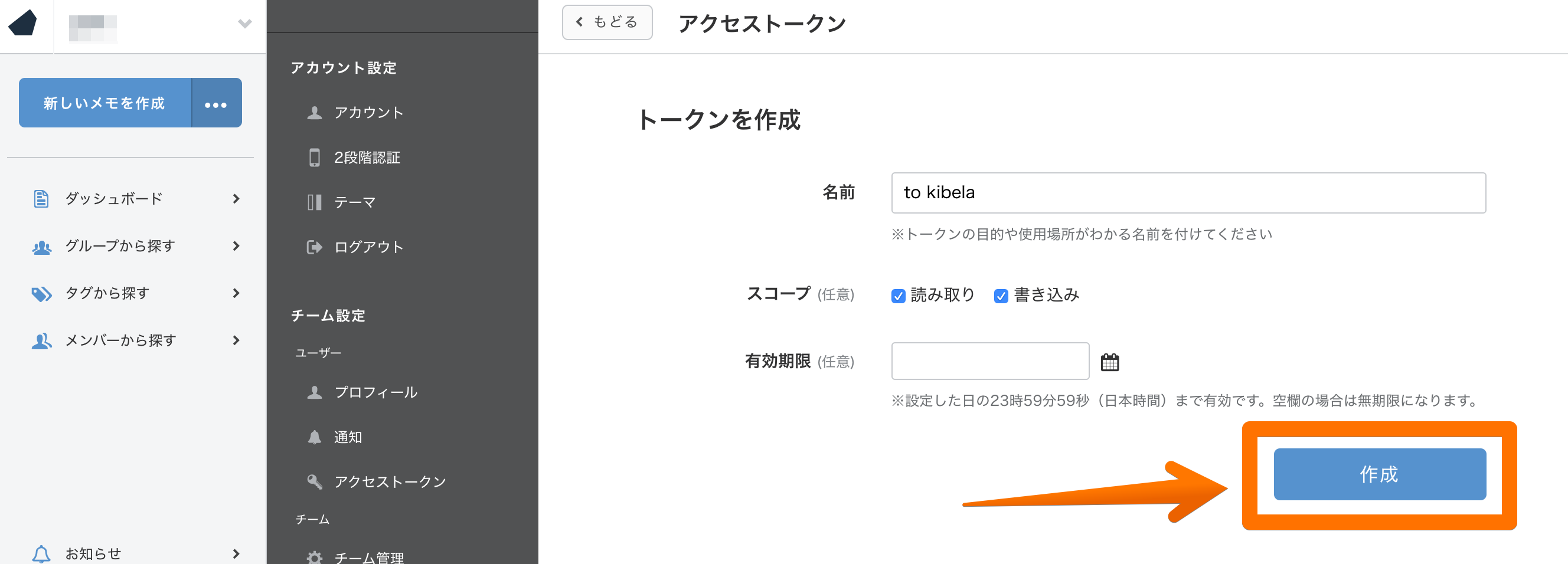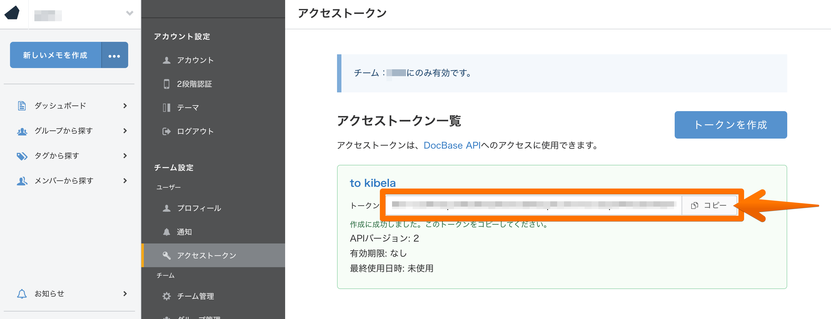 - https://**チーム名**.docbase.io/settings/tokensへアクセスし、API token(アクセストークン)を取得します。「トークンを作成」をクリック。