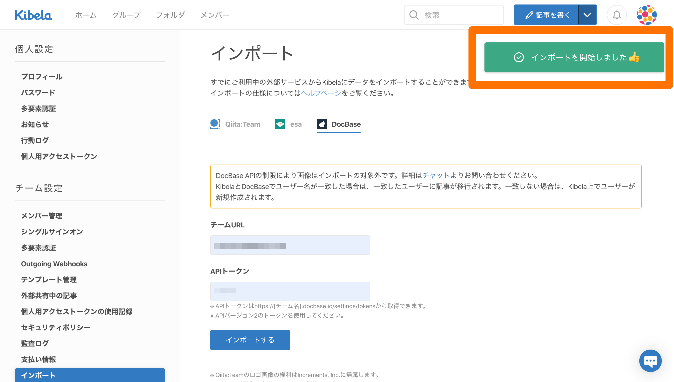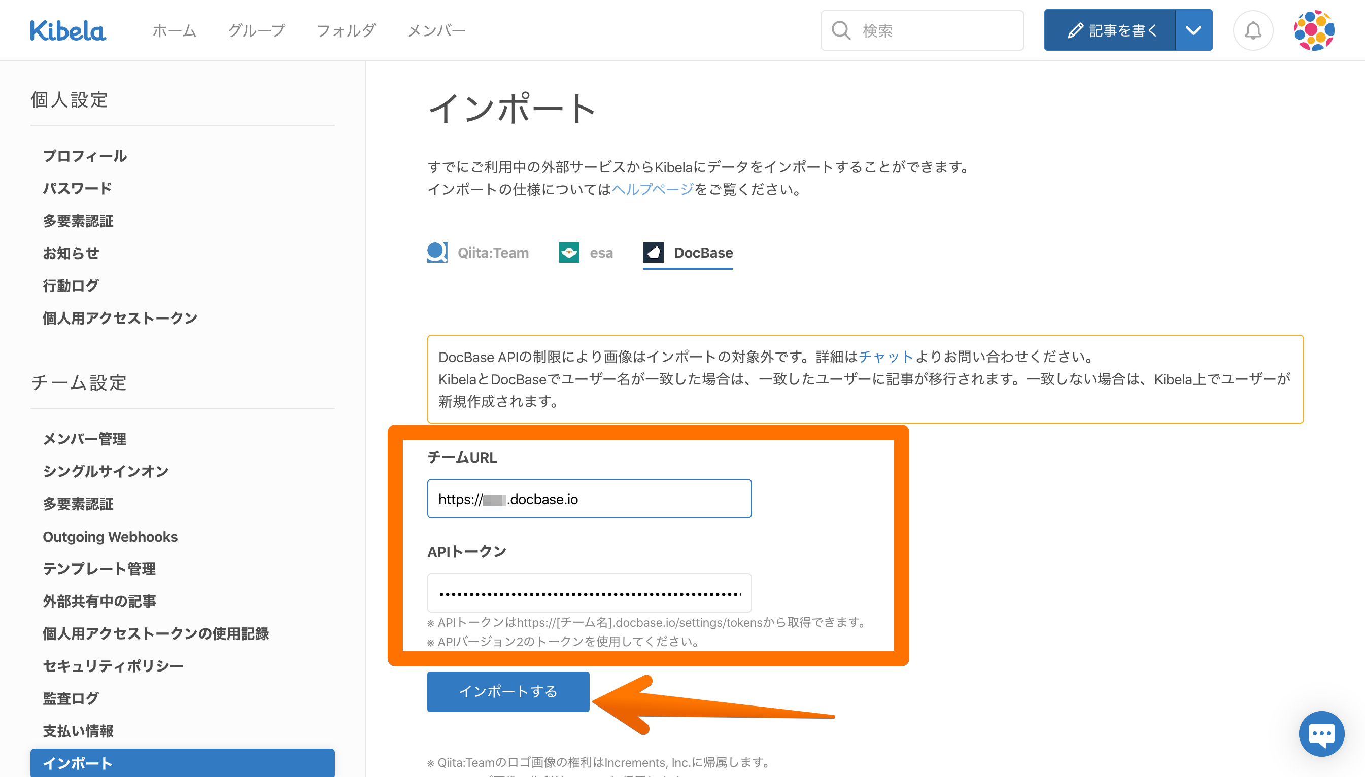 - Kibelaのインポートページへ遷移。DocBaseタブを選択しDocBaseのチームURL、APIトークン(先程取得した個人用のアクセストークン)を入力。「インポートする」をクリック。
