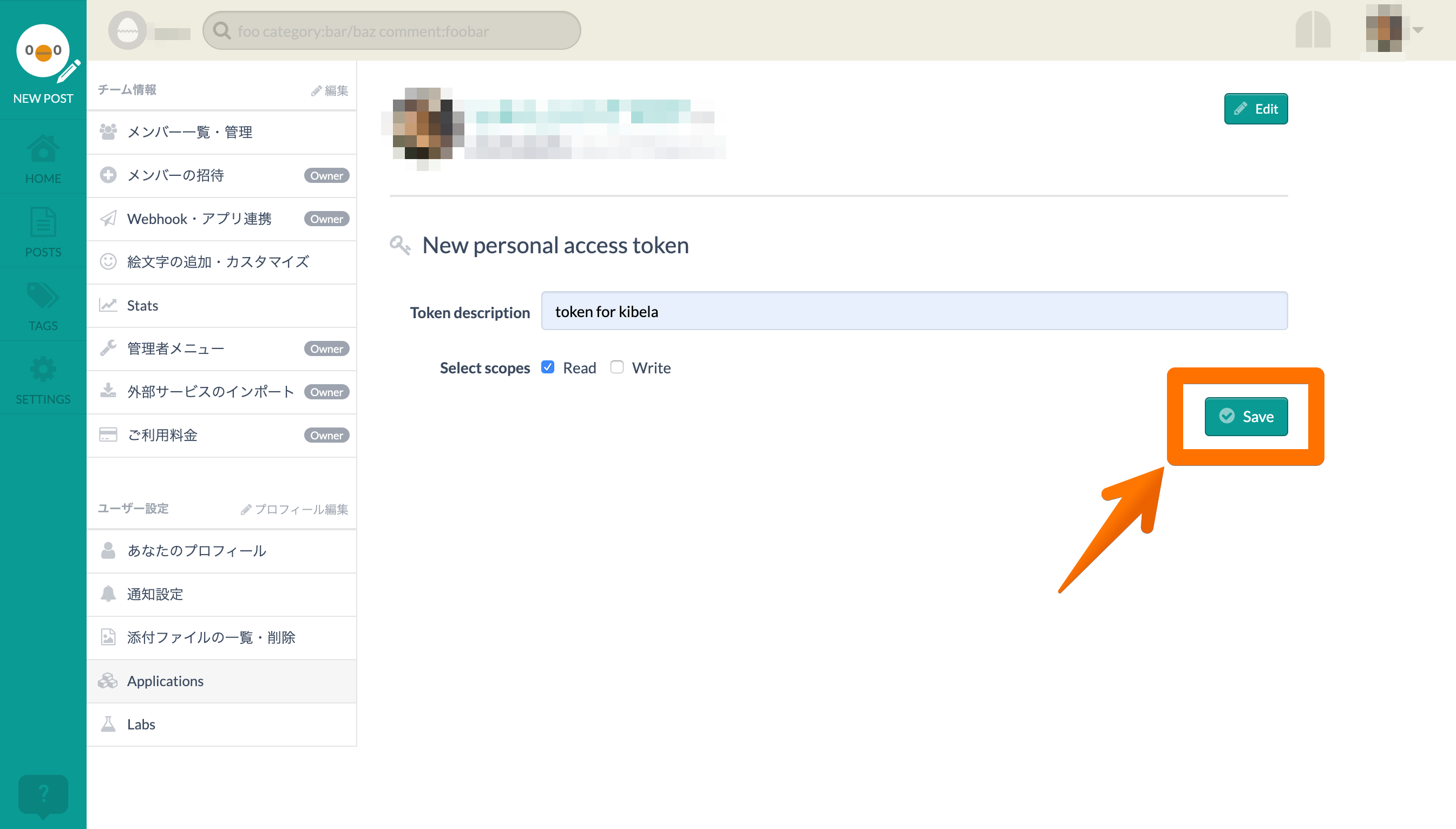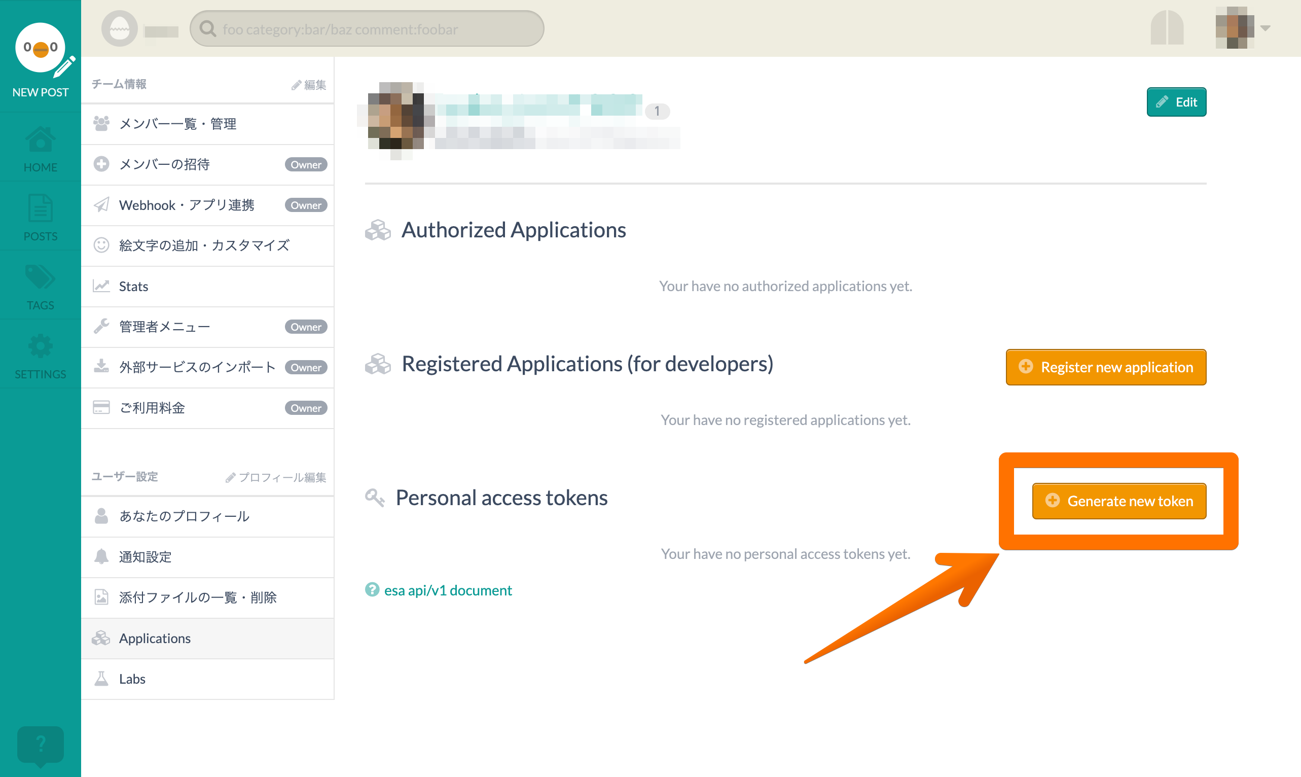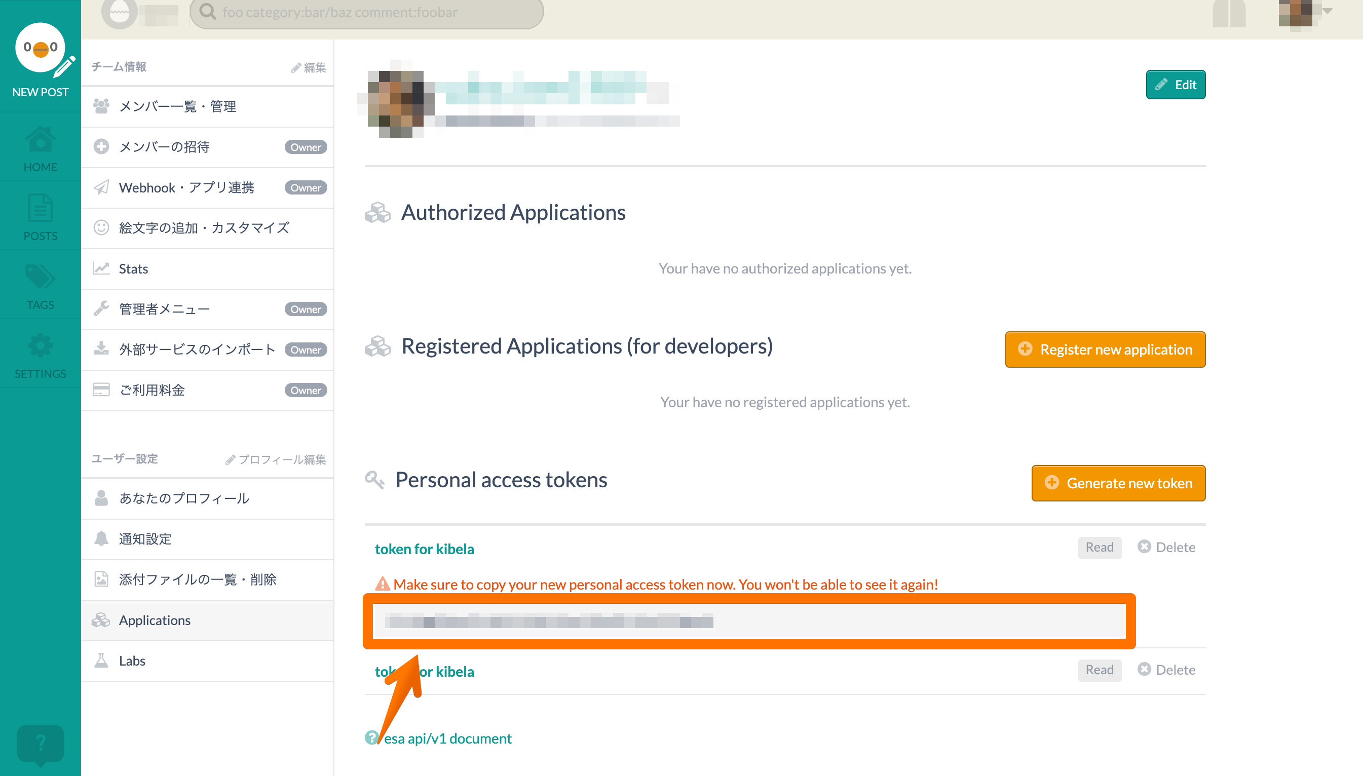 - https://**チーム名**.esa.io/user/applicationsへアクセスし、API token(アクセストークン)を取得する。