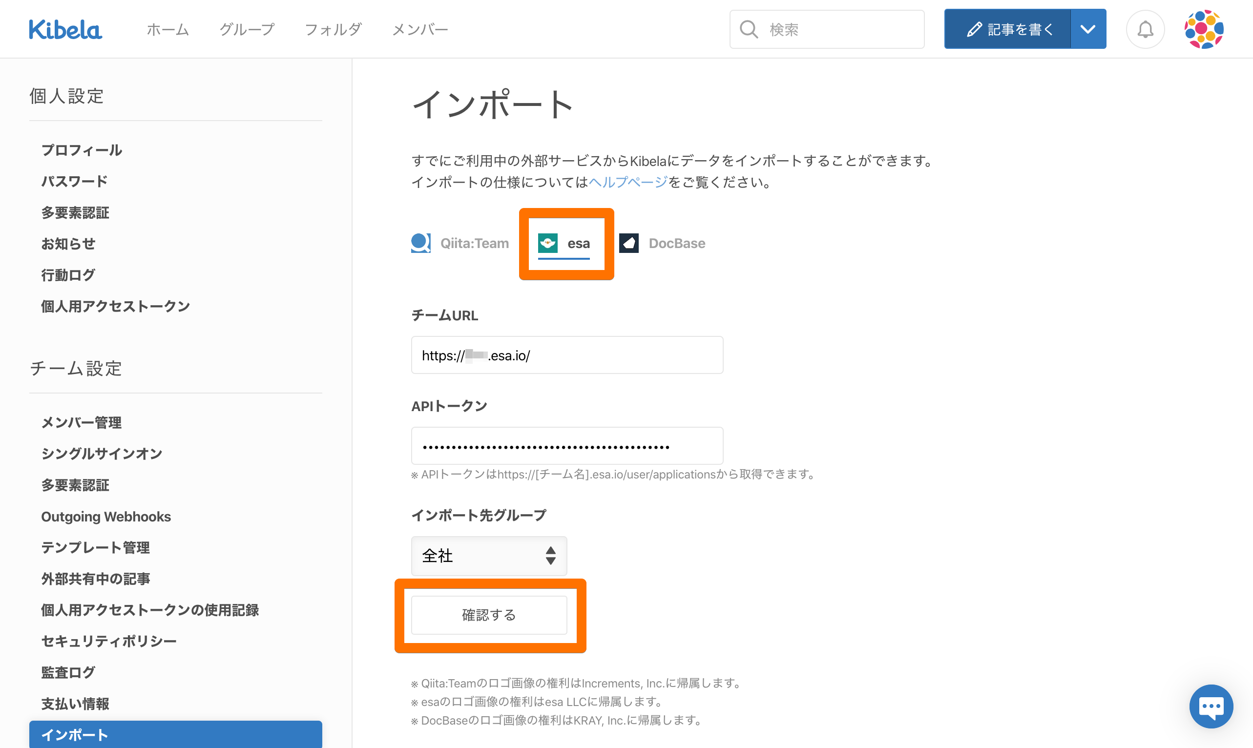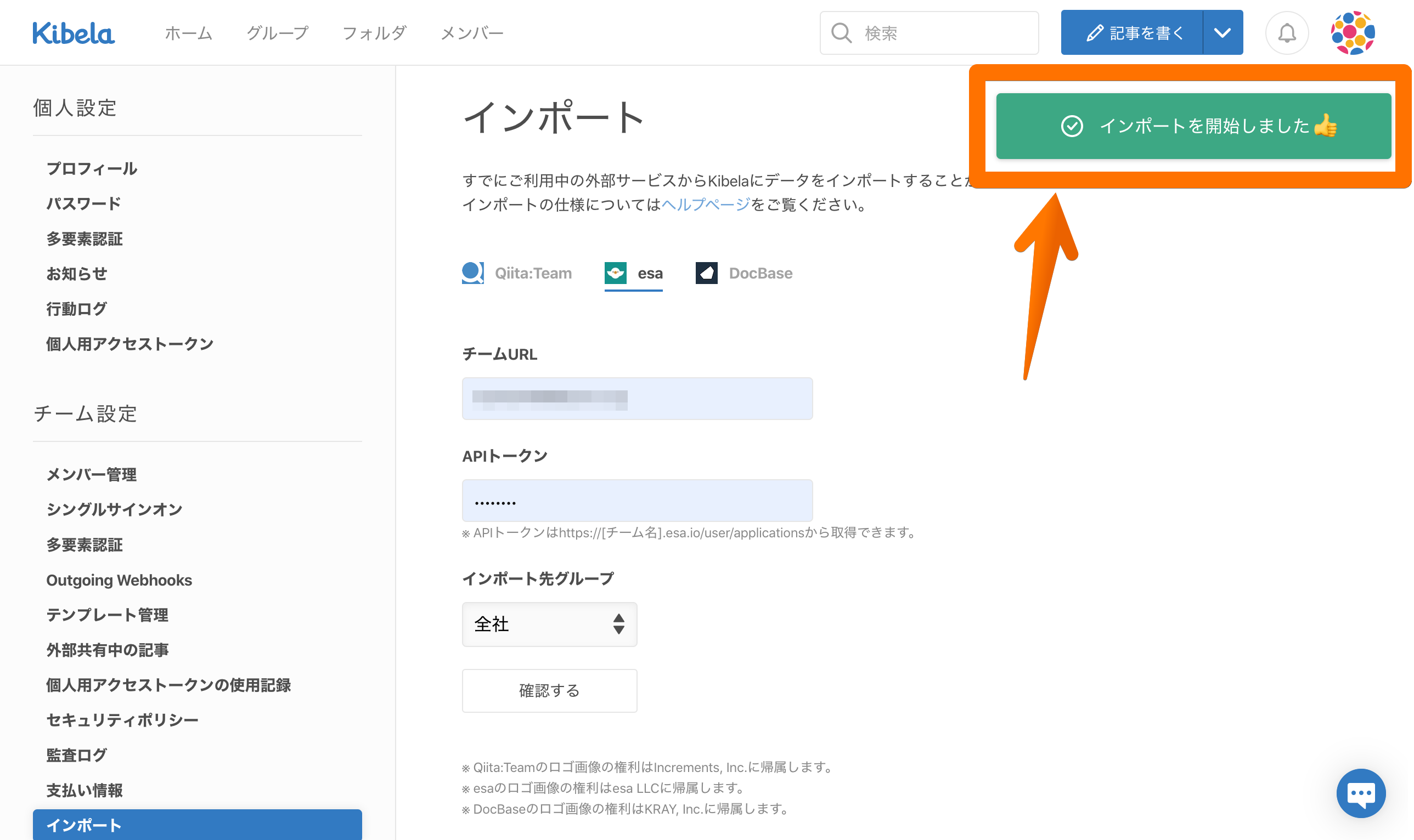 - Kibelaのインポートページへ遷移。esaタブを選択しesaのチームURL、APIトークン(先程取得した個人用のアクセストークン)を入力。