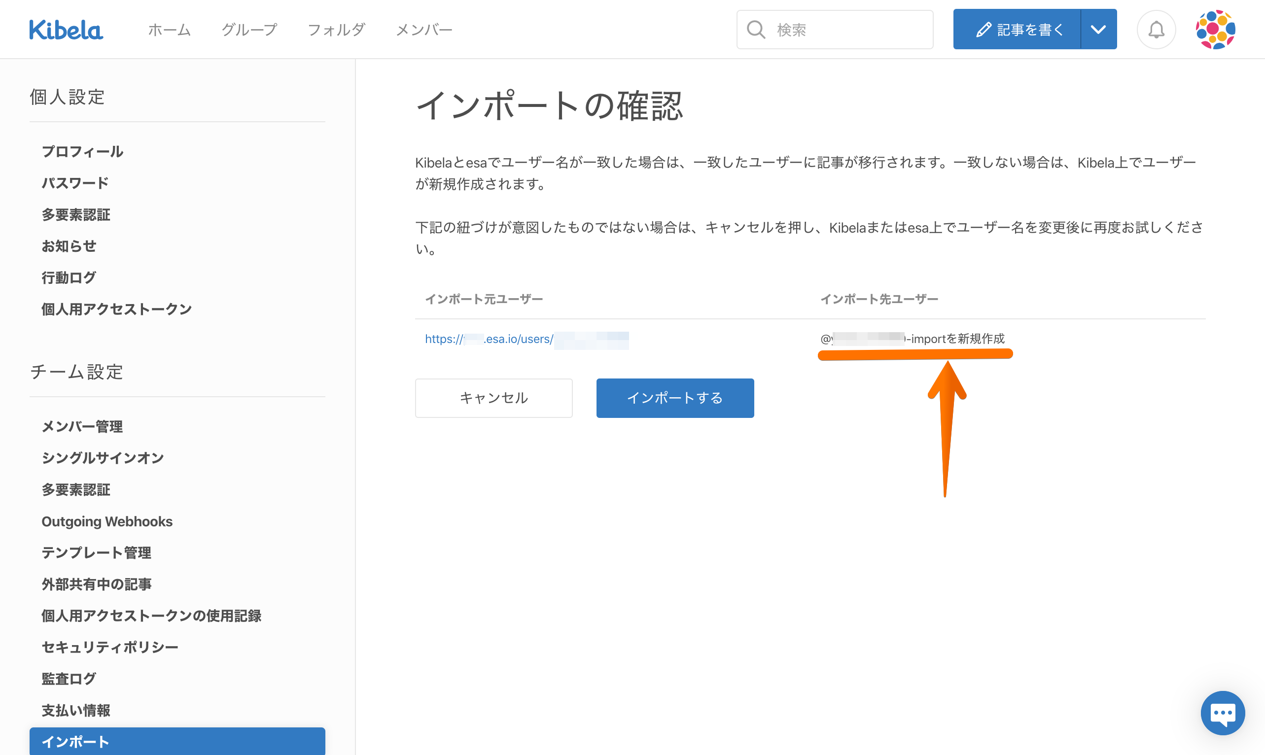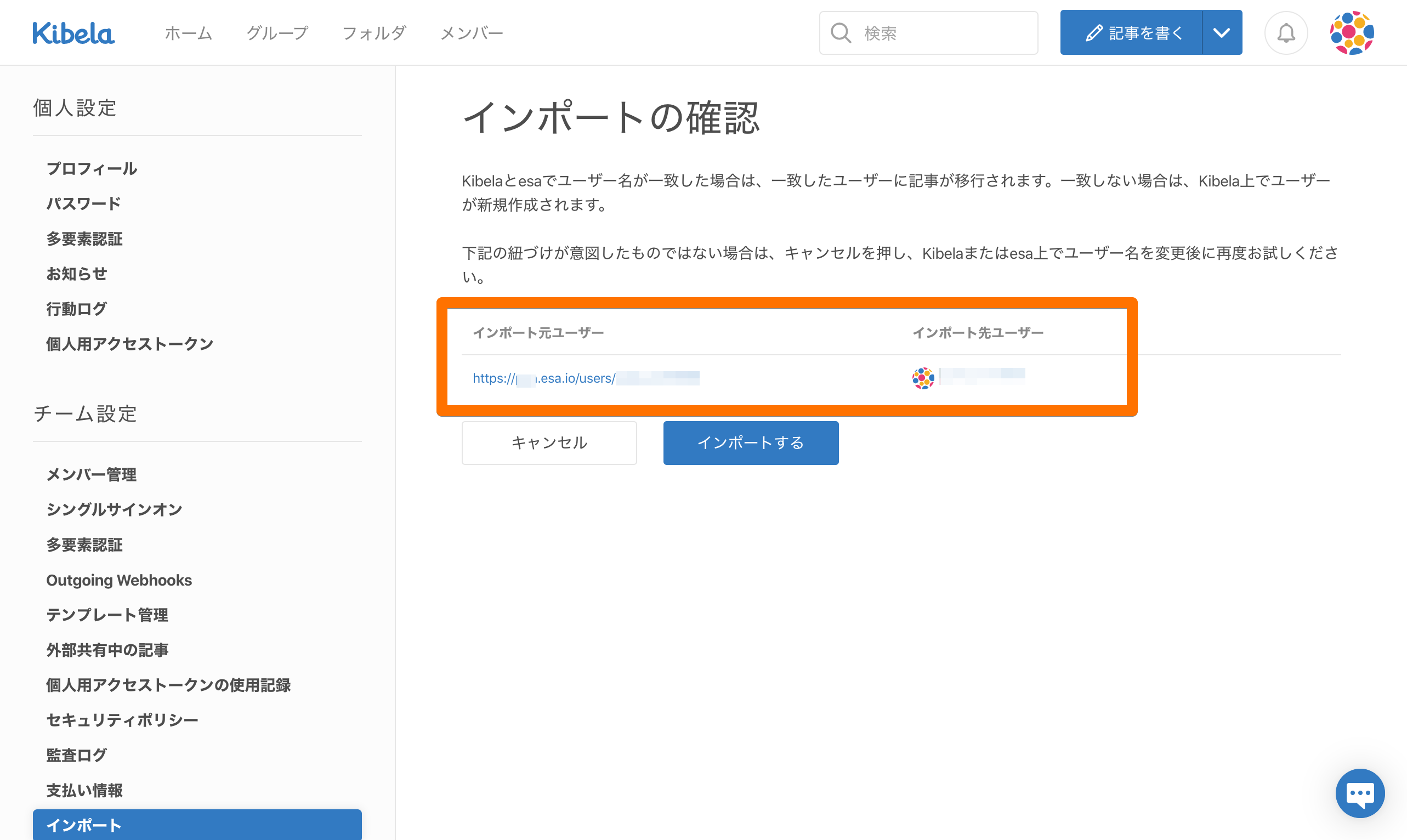 インポート先グループを選択肢「確認する」をクリック。ここで選んだグループに、esaからインポートした記事全てが所属することとなります。 - インポート実行前に確認を行います。Kibelaアカウントのユーザー名とesaのスクリーンネームが一致している場合は、下記表示となります。問題なければ「インポートする」をクリック。
