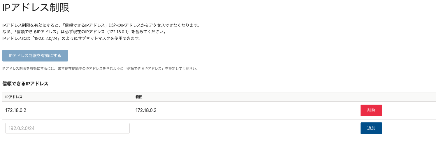 (アクセス中のIPアドレスが「信頼できるIPアドレス」に追加された状態)