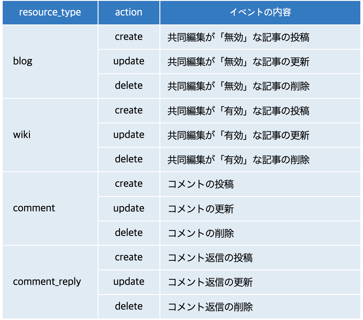 resource_typeはどのリソースに対してイベントが発生したかを表し、actionはどのようなイベントが発生したかを表しています。