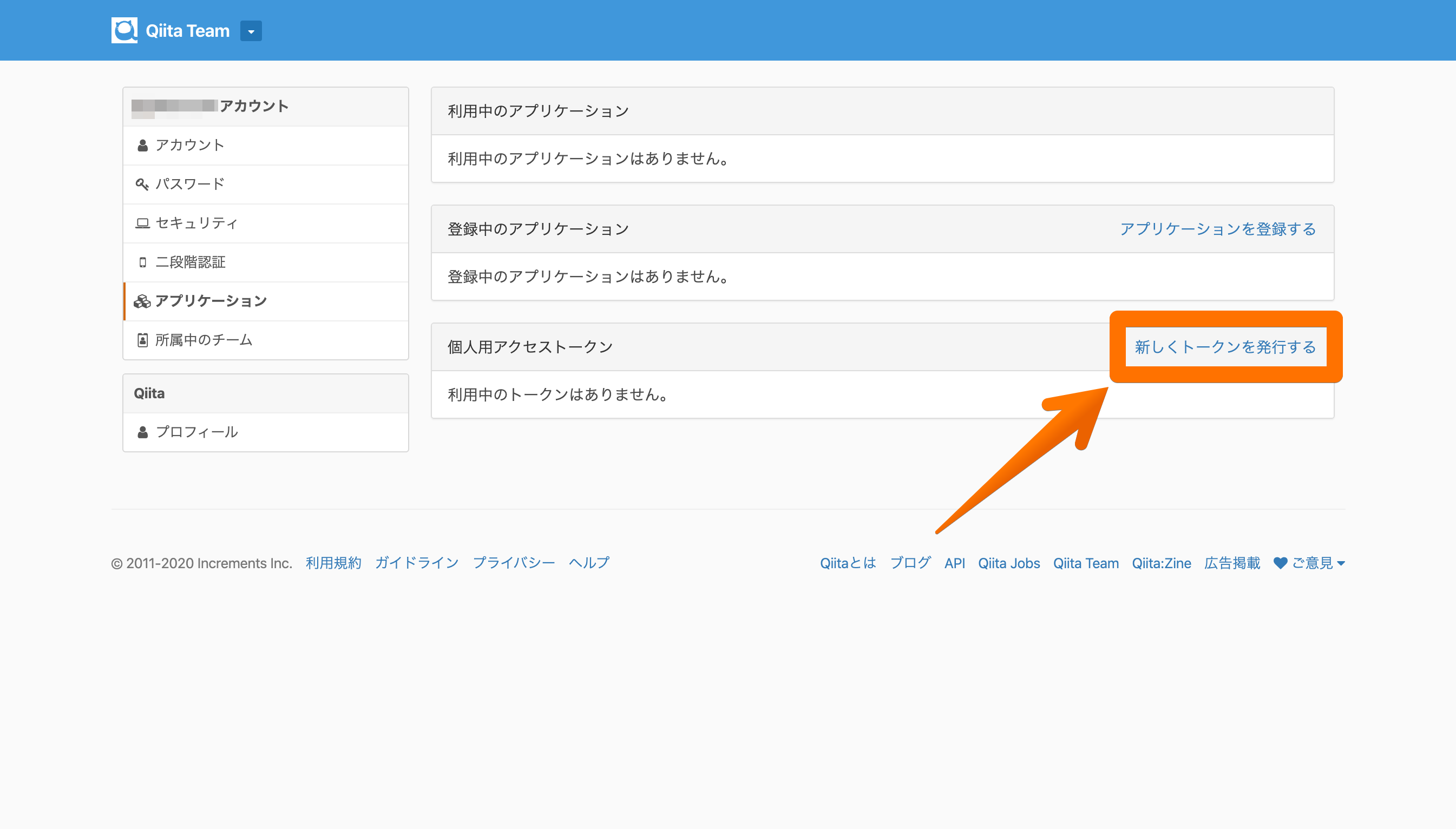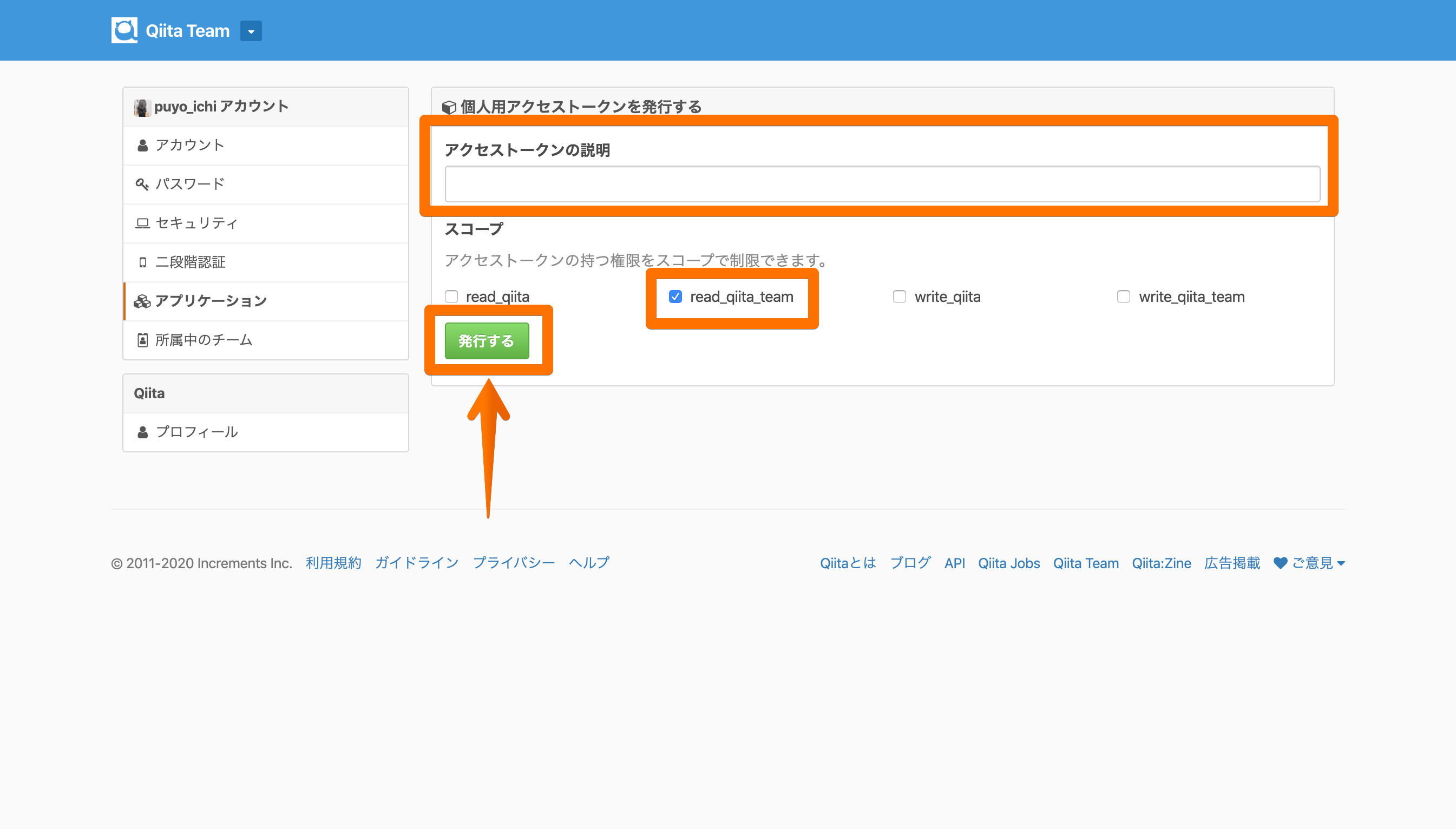 https://teams-center.qiita.com/settings/applicationsへアクセスし、「新しくトークンを発行する」をクリック。 - ”アクセストークンの説明”を入力し、API tokenのスコープは”read_qiita_team”にチェックを入れ「発行する」をクリック。