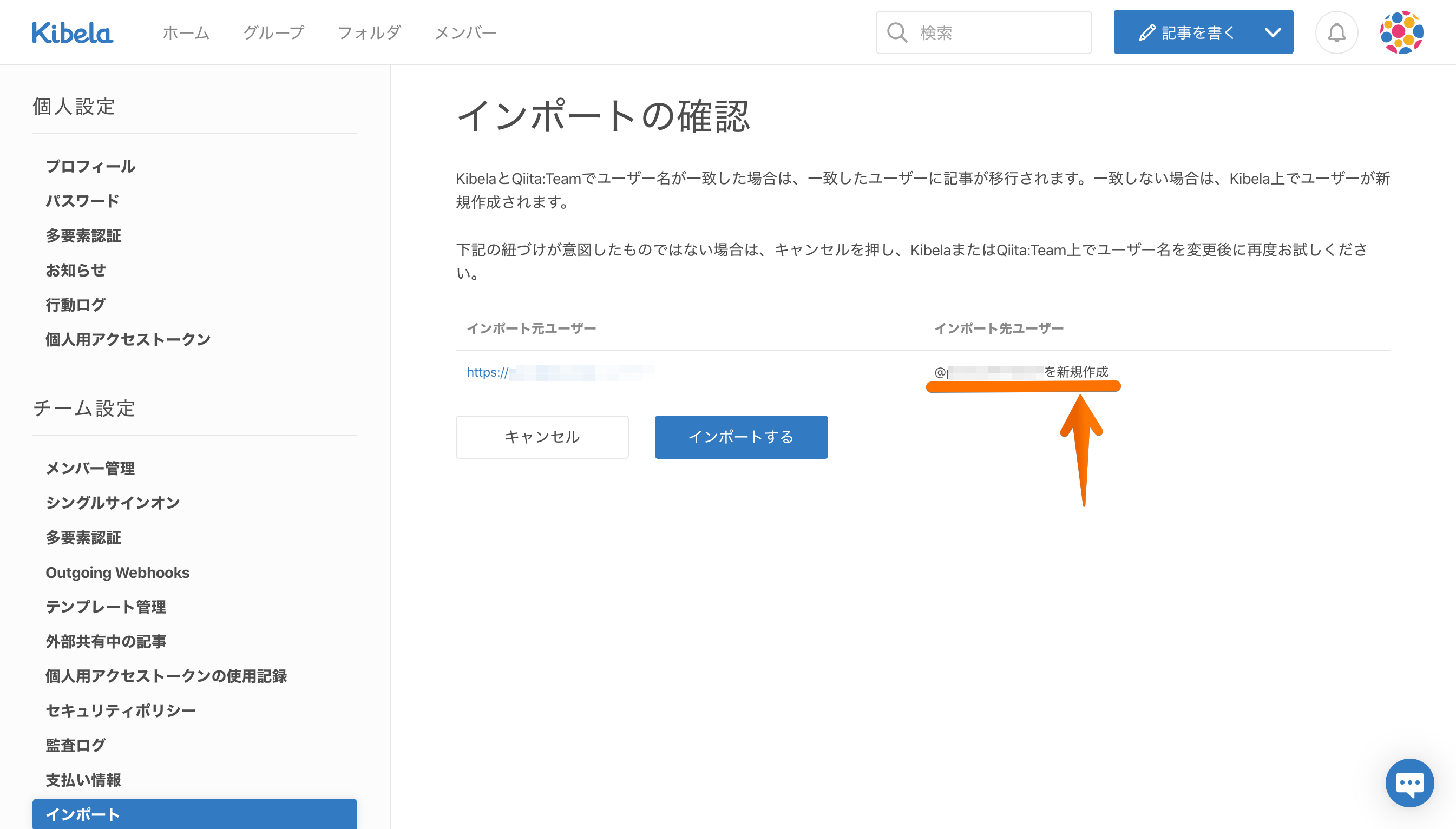 インポート実行前に確認を行います。Kibelaアカウントのユーザー名とQiita Teamのアカウント名が一致している場合は、下記表示となります。問題なければ「インポートする」をクリック。