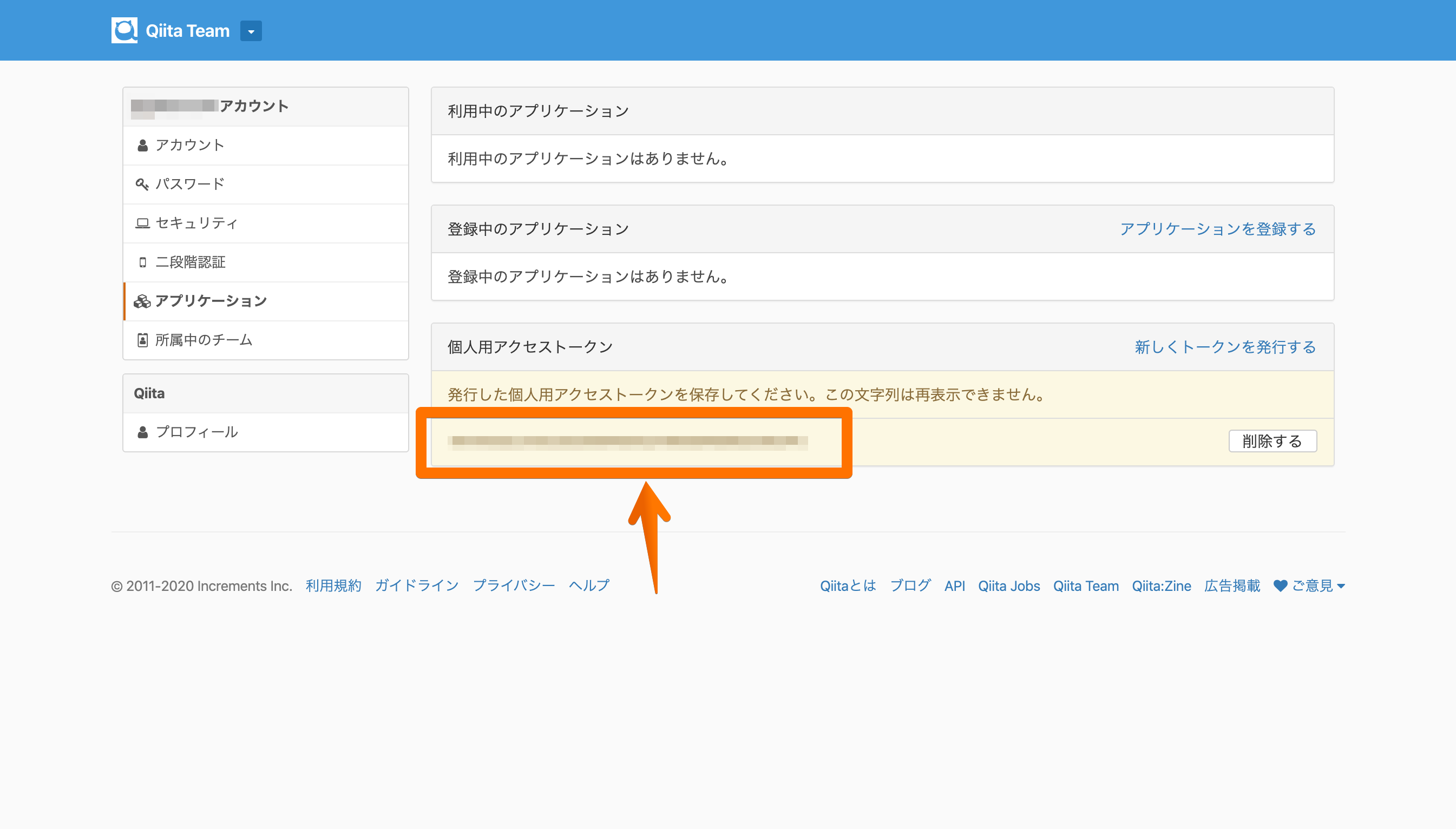 - 個人用のアクセストークンが生成されます。コピーし保管してください。