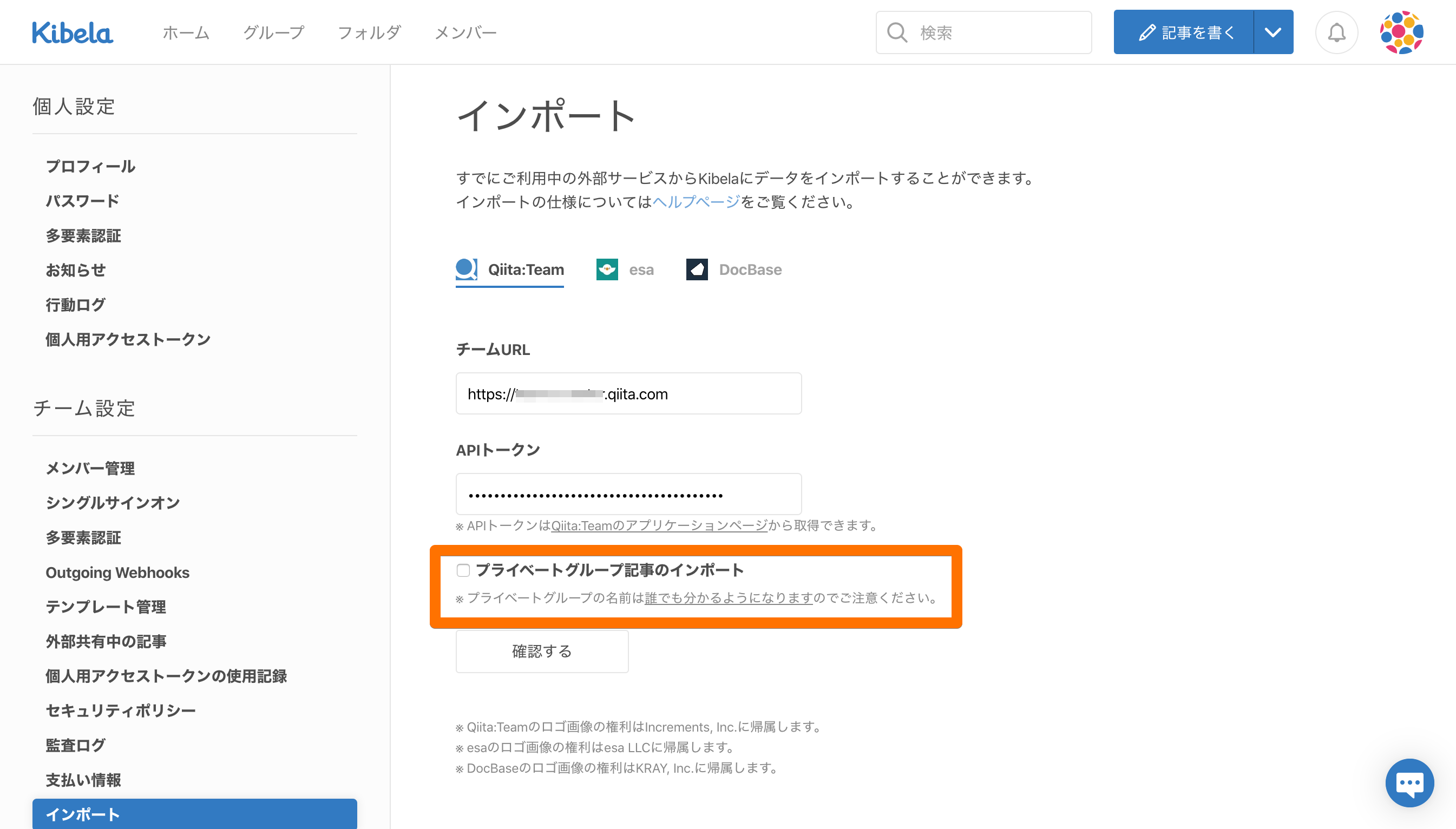 - Kibelaのインポートページへ遷移。Qiita Teamタブを選択しQiita TeamのチームURL、APIトークン(先程取得した個人用のアクセストークン)を入力。